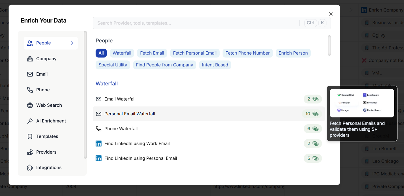 Any step that pulls data, researches, scrapes, or generates output is called an enrichment. You can find all enrichments under the Enrichments tab.