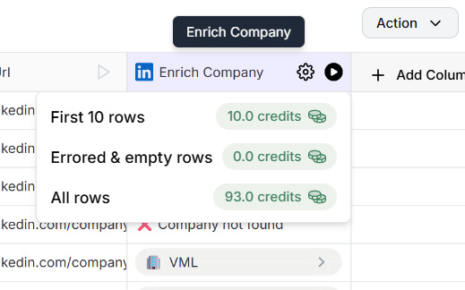 - Each column is a step in the workflow (example: find email, find phone, enrich account)
